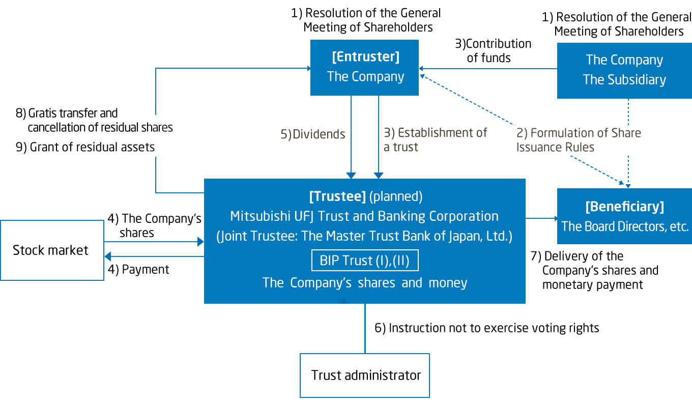 3) The Company entrusts money which the Company contributed as stock compensation and the money contributed by the subsidiary to the trustee, and establishes the Trust BIP(I) and Trust BIP(II) (hereinafter collectively referred to as the "Trusts"). The Trust BIP(I) is for the Board Directors, etc. of the Company who meet the beneficiary requirements as its beneficiary and the Trust BIP(II) is for the Board Directors, etc. of the subsidiary who meet the beneficiary requirements as its beneficiary. The Subject Companies are allowed to contribute money within the limit as approved by the general meeting of shareholders in 1).