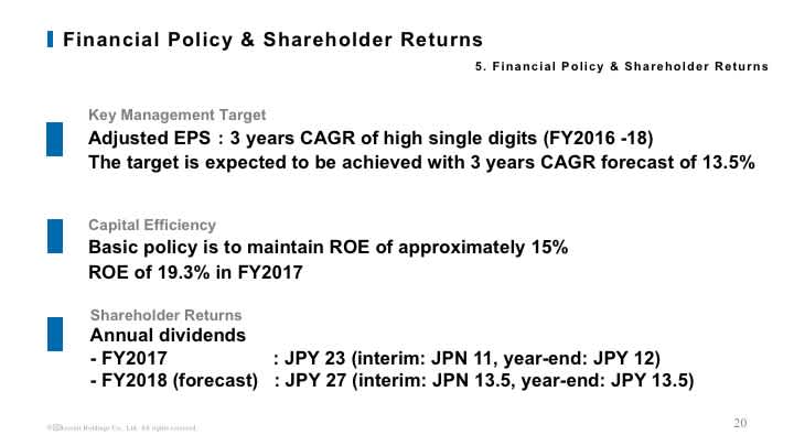 Adjusted profit, which excludes non-recurring income and losses, grew 8.3% to 144.9 billion yen, and adjusted EPS also increased 8.3% to 86.74 yen per share. We set adjusted EPS as a key performance indicator for management, and target 3 years Compounded Annual Growth Rate (CAGR) of high single digits from FY2016 to FY2018 in the mid-term management strategy. In FY2017, the second year of the targeted period, we achieved 8.3% growth in adjusted EPS, following 15.1% in FY2016, which was good progress towards the mid-term target.