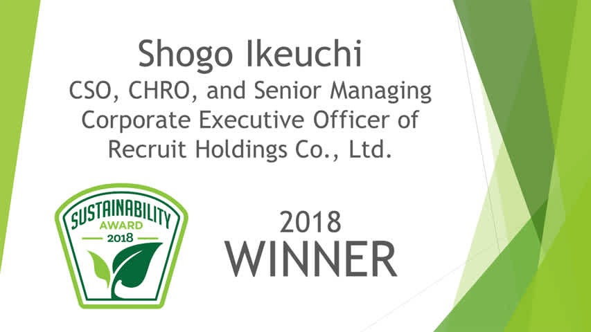 Recruit Holdings was recognized at the "2018 Sustainability Awards" (https://www.bintelligence.com/sustainability-awards/), as CSO, CHRO, and Senior Managing Corporate Executive Officer, Shogo Ikeuchi was awarded in the Sustainability Hero (Executive) category, and "Study Sapuri" and "Quipper" were awarded in the Sustainability Service of the Year category. Also, "Geppo" was named a finalist in the Sustainability Service of the Year category.