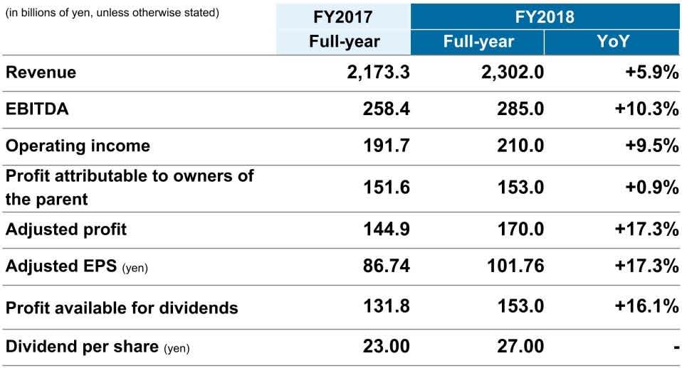Operating income increased 16.8% year on year to 126.5 billion yen. This was mainly due to an increase in EBITDA, and a non-recurring gain resulting from the sale of subsidiaries. Adjusted EPS, excluding non-recurring income and losses, grew 21.4% year on year.