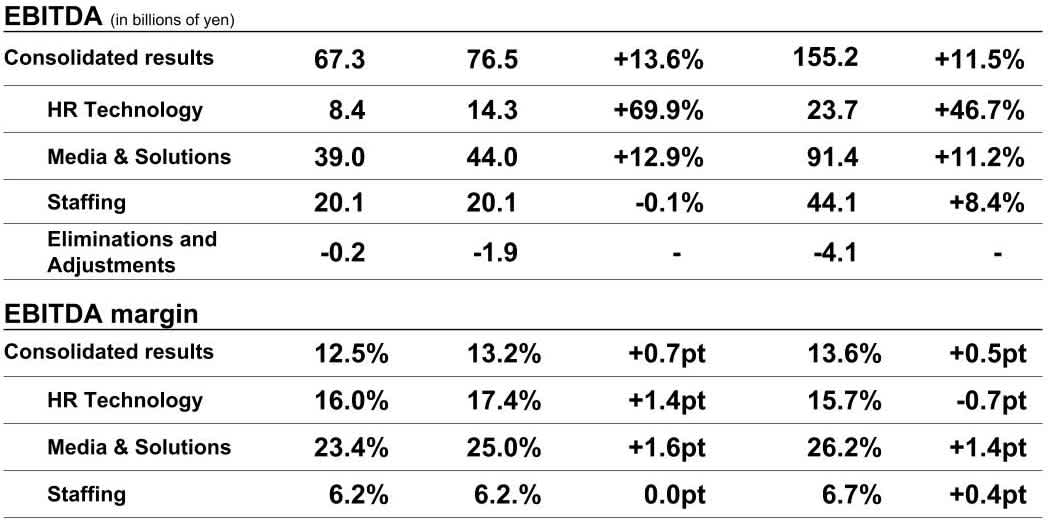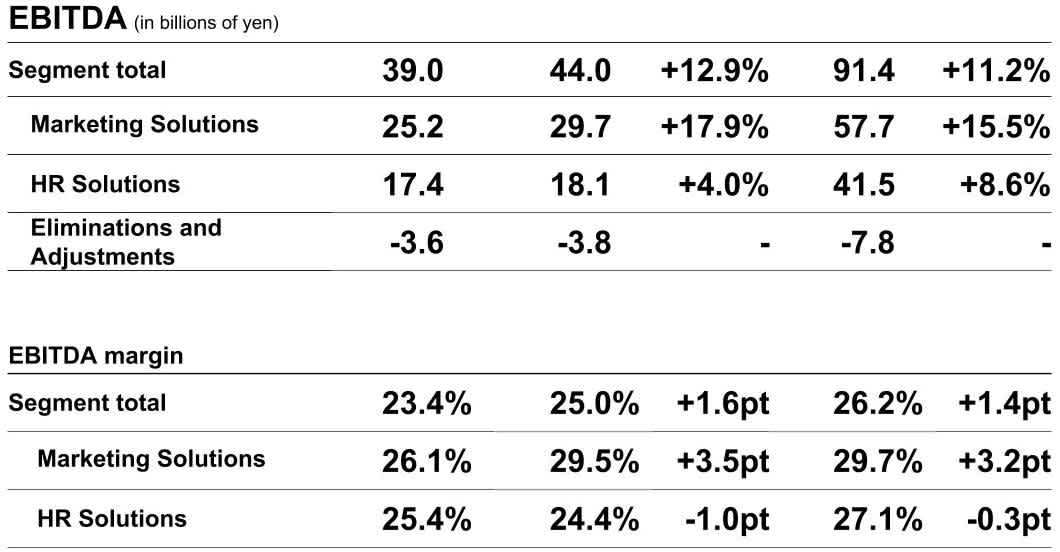 In HR Solutions, the Recruiting in Japan subsegment, particularly the professional recruiting businesses, saw strong performance supported by the continued favorable business environment in the Japanese labor market. As a result, quarterly revenue increased 8.2% year on year, quarterly EBITDA increased 4.0%, and EBITDA margin was 24.4%. Excluding the impact of the change in the treatment of intra-group transactions, EBITDA increased 1.8%.