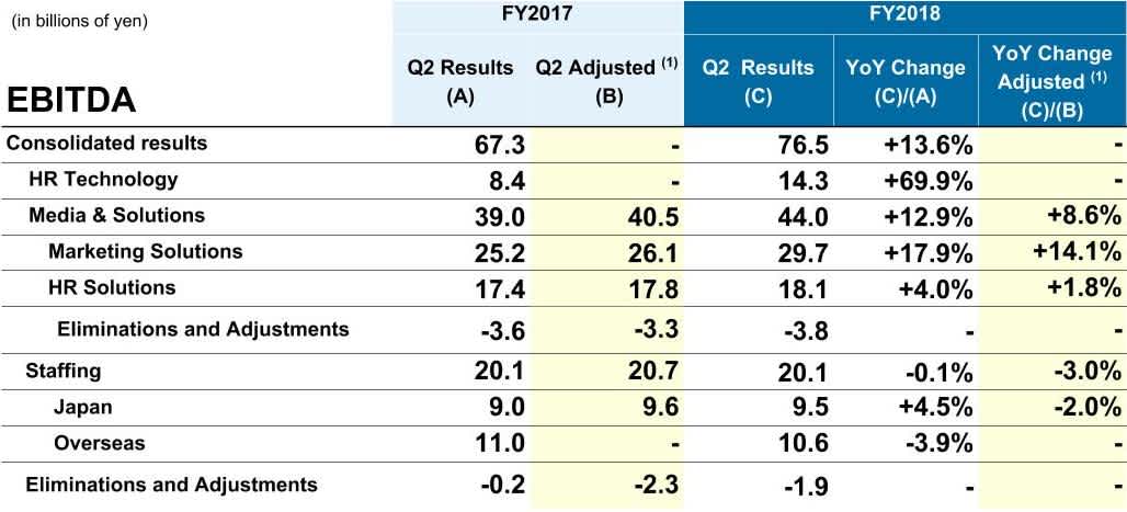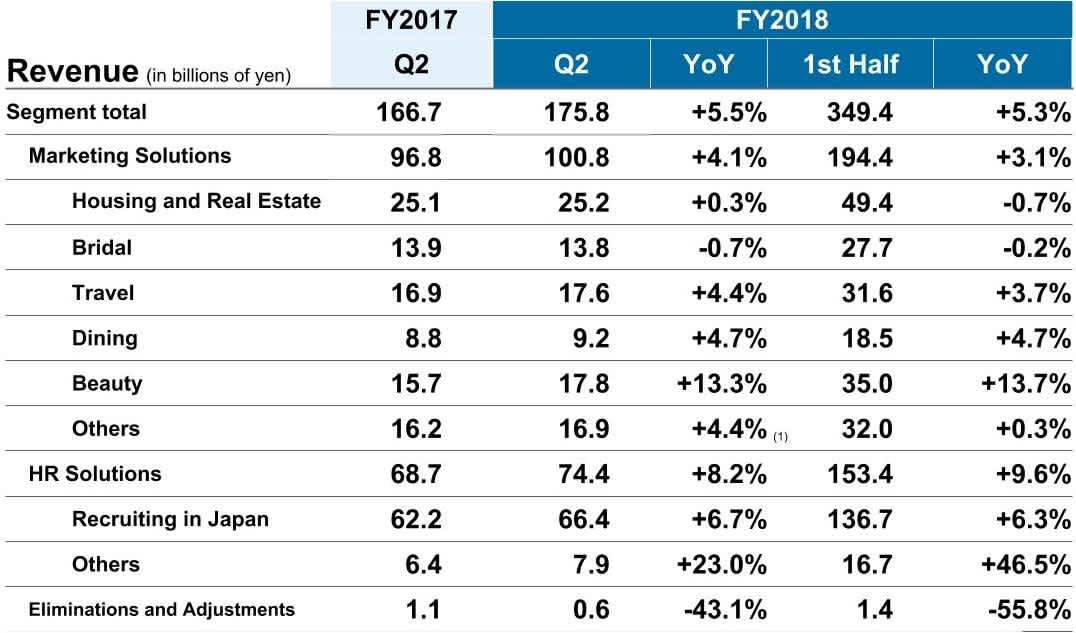 (1) The recruiting assessment business previously recorded in Recruiting in Japan was transferred into Others in HR Solutions, and the placement business for the medical industry previously recorded in Eliminations and Adjustments in Media & Solutions was transferred to Recruiting in Japan from Q1 FY2018. Excluding these one-time factors, revenue in Recruiting in Japan increased 7.3%.