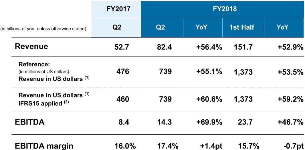 The consolidated revenue for the first half of fiscal year 2018 increased 7.5% year on year to 1 trillion 143.3 billion yen. EBITDA grew 11.5% to 155.2 billion yen, and EBITDA margin was 13.6%.