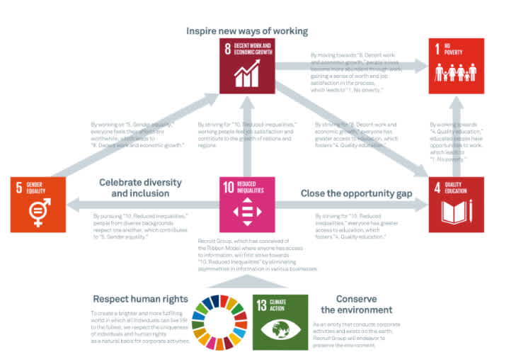 As the basic principle of our corporation, Recruit Group is focused on creating new value for our society to contribute to a brighter world where all individuals can live life to the fullest. To achieve this vision, we carry out our businesses using our unique business model called the Ribbon Model by eliminating the inequality of information access and expand opportunities to contribute to SDG 10: Reduced Inequalities.