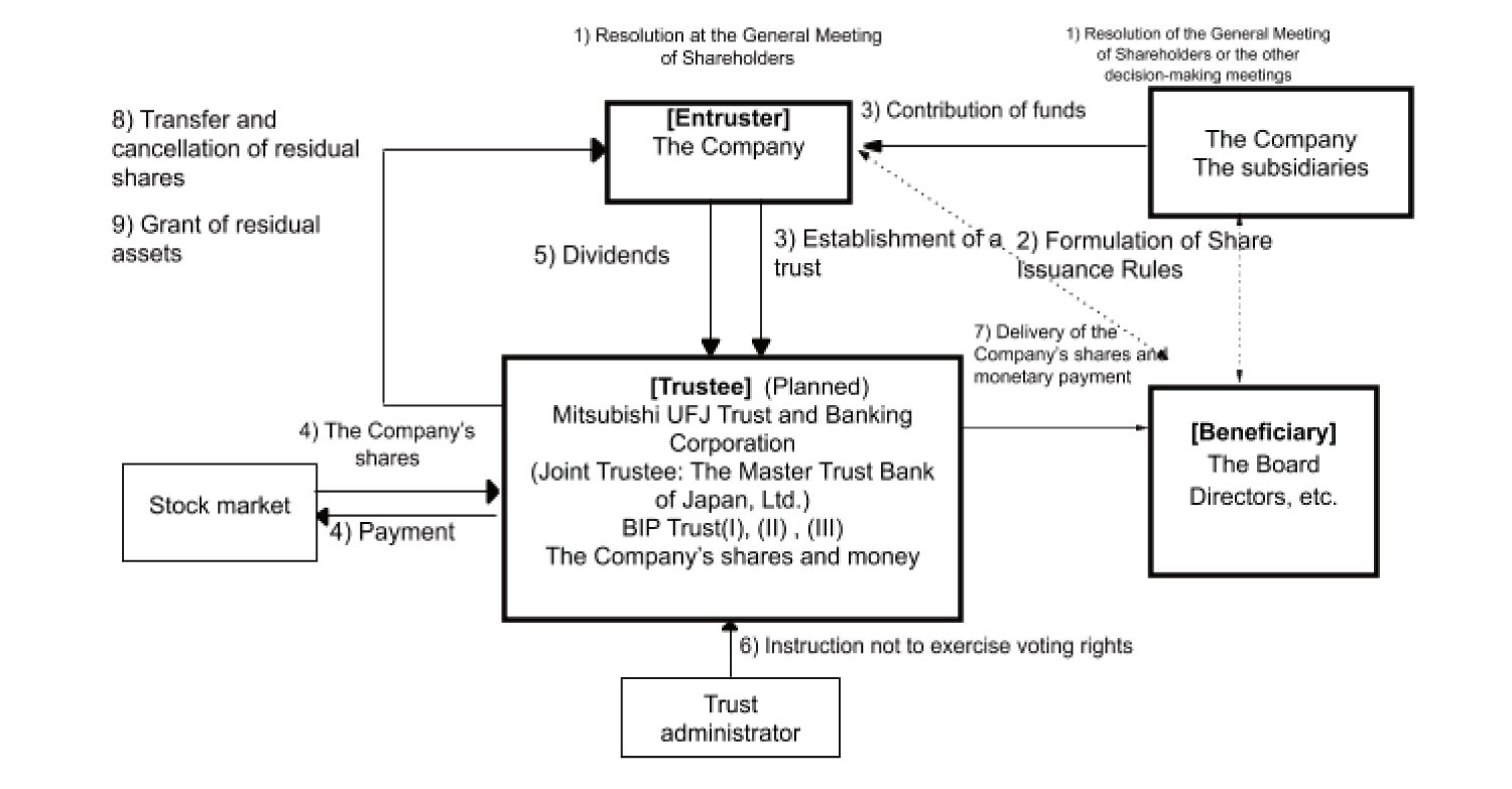 3) The Company entrusts money which the Company contributed as stock compensation and the money contributed by the subsidiaries to the trustee, and establishes or extends the Trust BIP(I),Trust BIP(II) and Trust BIP(III) (hereinafter collectively referred to as the "Trusts"). The Trust BIP(I) is for the Directors of the Board and Senior Management of the Company who meet the beneficiary requirements as its beneficiary and the Trust BIP(II) and Trust BIP(III) is for the Directors of the Board and Senior Management of the subsidiaries who meet the beneficiary requirements as its beneficiary. The Subject Companies are allowed to contribute money within the limit as approved by the annual meeting of shareholders or the other decision-making meetings in 1).