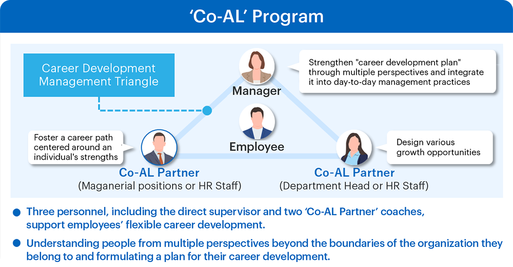 The “Co-AL” program systematizes Recruit’s long-standing employee development methods. It involves having multiple managers understand each employee’s values and motivations, and to create career plans that leverage individual differences.