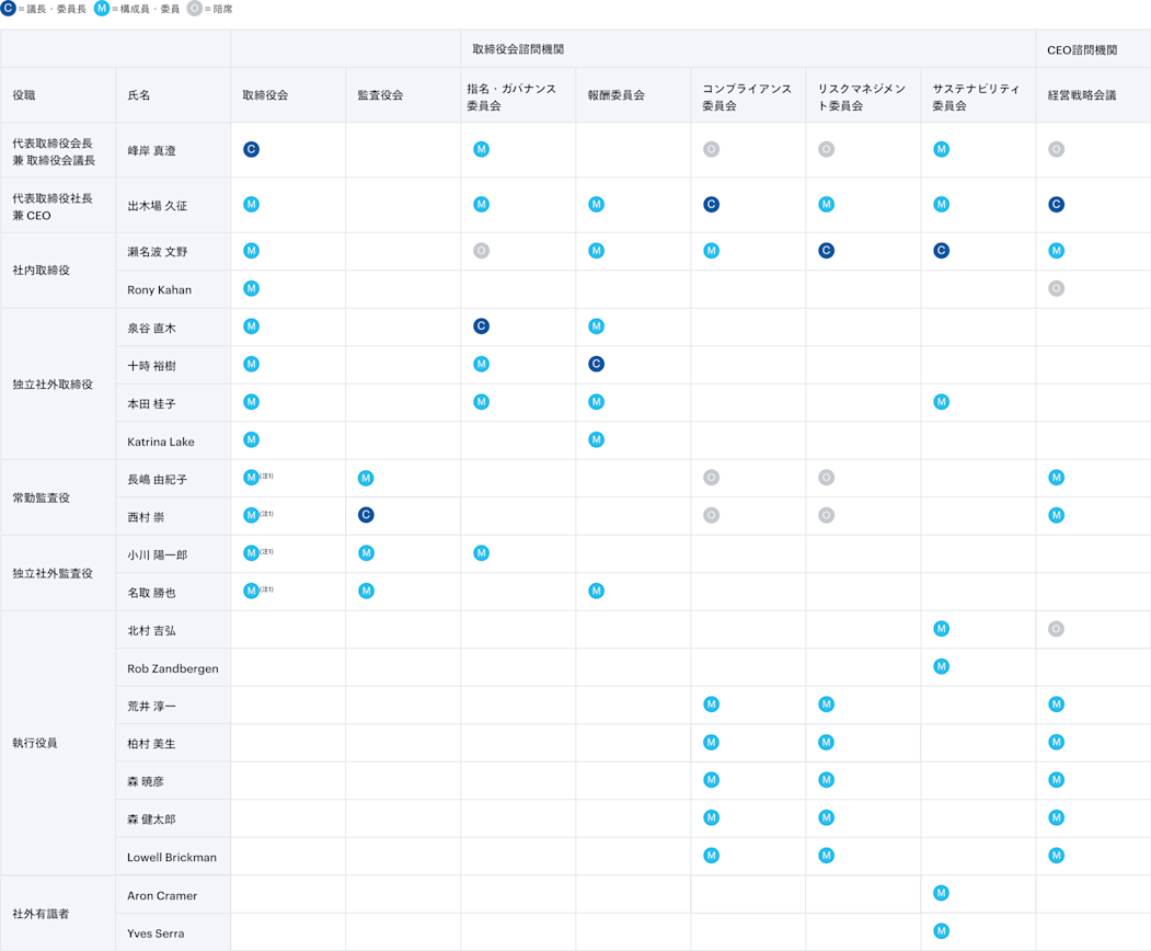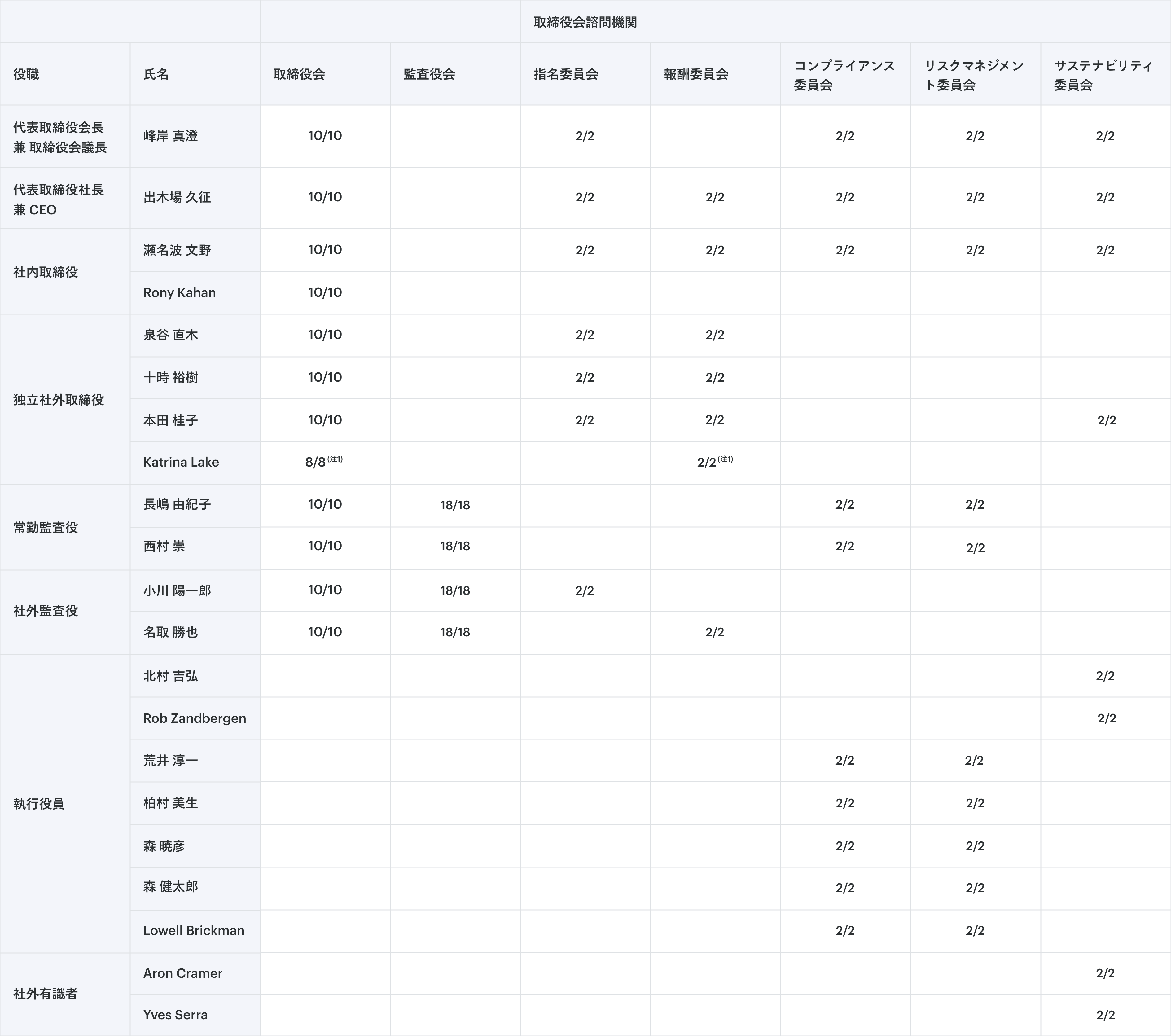 (注1) 監査役は、日本の会社法上、取締役の職務執行を監査する者として取締役会への出席義務があります。