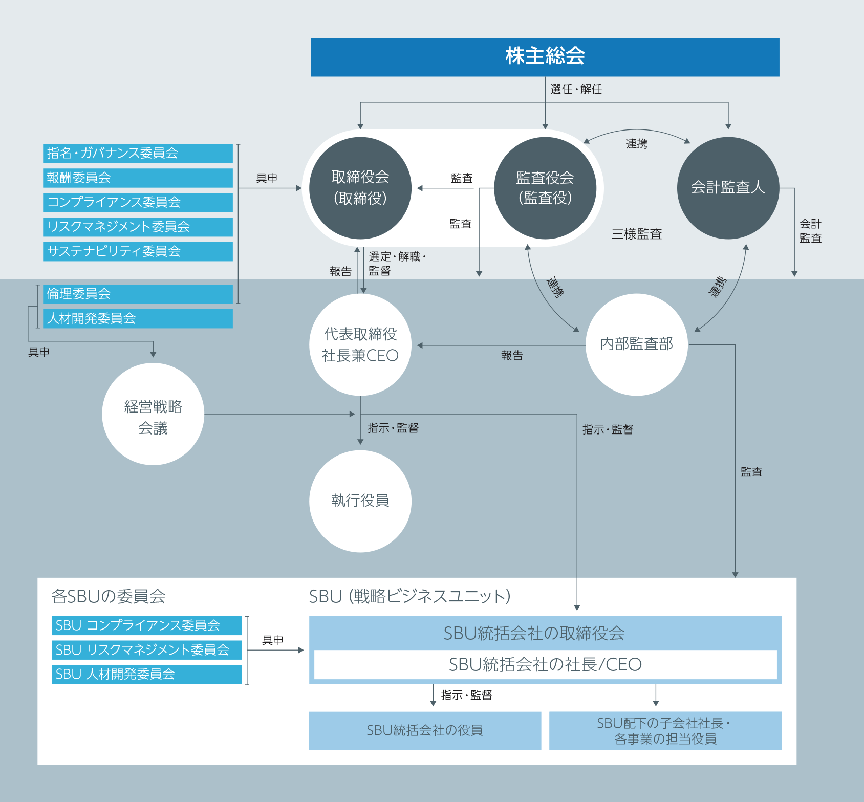 SBUにおける重要な意思決定は、SBU統括会社の取締役会で行っています。SBU統括会社の取締役会の過半数は、当社から派遣される非業務執行取締役で構成されています。また、各SBUの責任者は、当社の執行役員が兼任しています。
