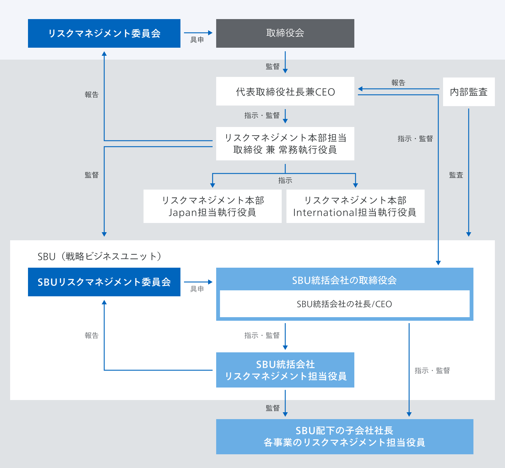SBU統括会社では、当該SBUにおけるリスクマネジメント担当役員を任命し、当該SBUにおける子会社の事業に関連するリスクマネジメントの状況のモニタリングを行っています。これに加え、SBU統括会社は、それぞれSBUリスクマネジメント委員会を半期に一度開催し、SBUを取り巻くリスクを包括的に確認して議論を行うとともに、SBUのトップリスクの選定と対応策の決定を行い、それらのリスクの状況のモニタリングを行っています。