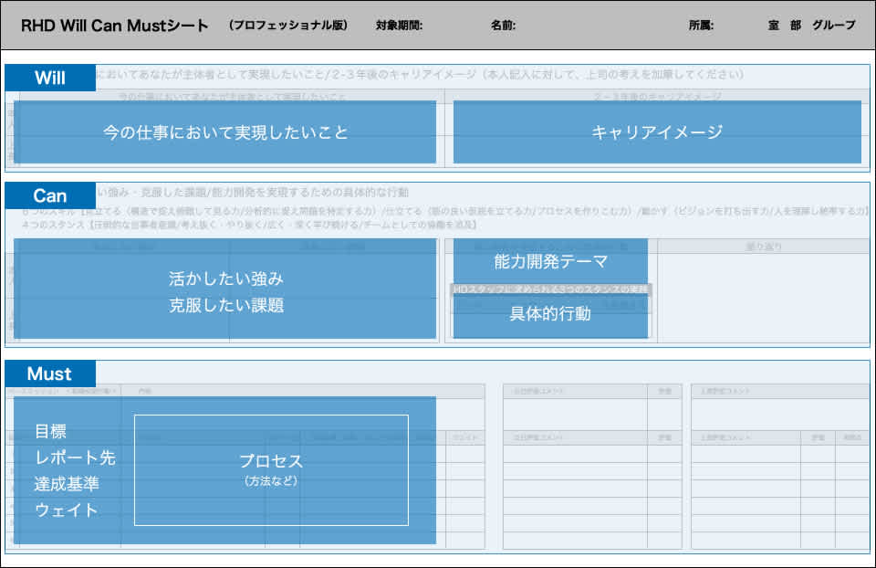 一人ひとりの主体的な想いを目標に結びつける「Will Can Mustシート」