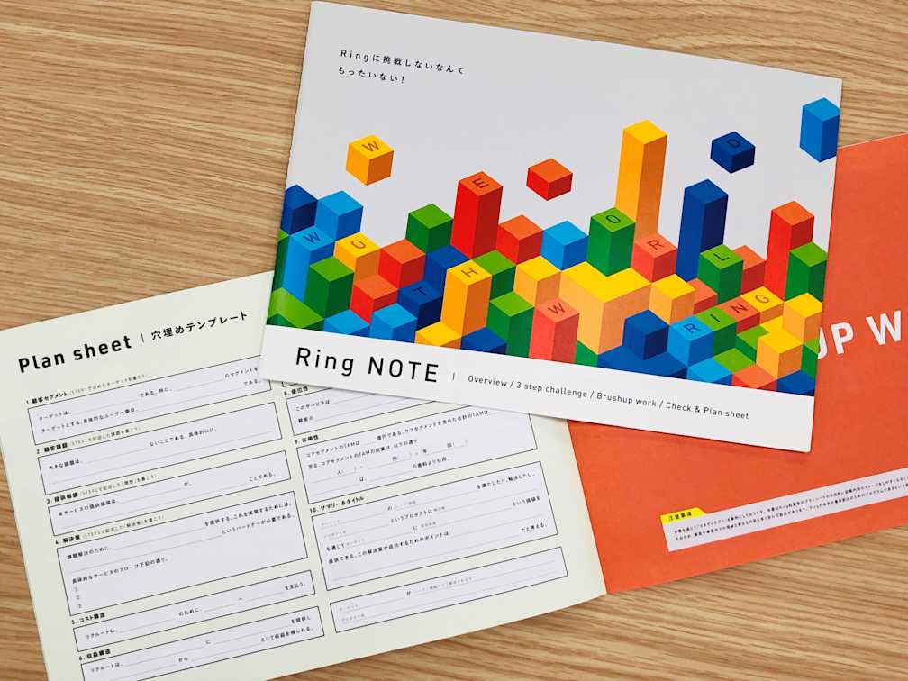 ビジネスアイデアコンテストRingで配布される「Ring NOTE」。本ノートのフレームワークに沿って考えることで、初心者でも検討を進められるように構成されている。
