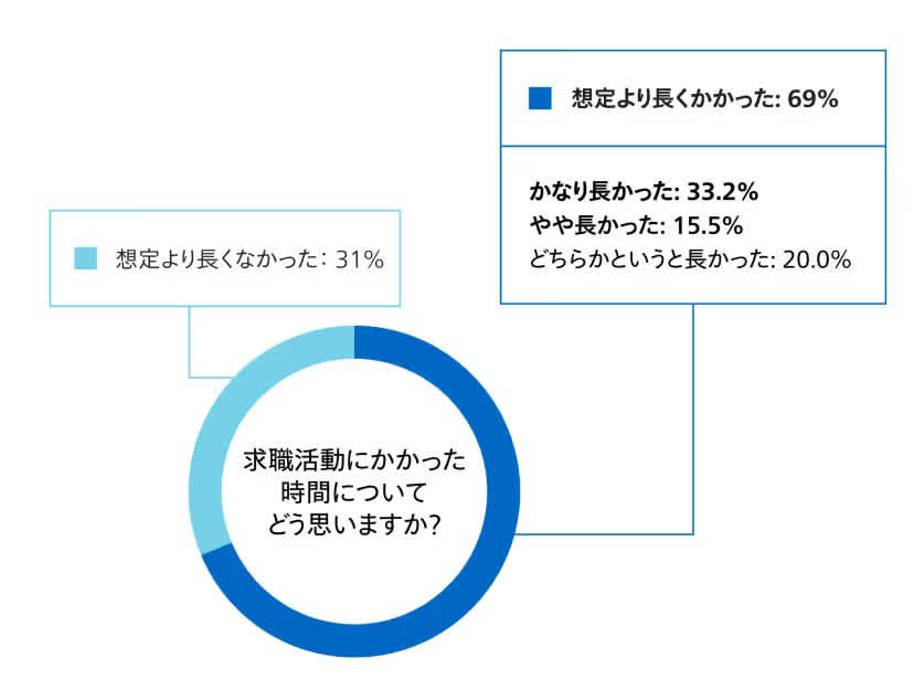 就業までに掛かる時間について、求職者はどう感じているのでしょうか。私たちが展開する国・地域のうち30か国を対象に、17言語で実施したグローバル求職者サーベイによると、回答者の約半数が、生活水準を保てる期間よりも長い時間、仕事を探していることがわかりました。また、仕事探しの期間については、回答者の約3分の2が「想定よりも長かった」と述べており、その約半数は「かなり長かった」と感じていることがわかりました。この結果からも、より速く仕事に就きたい求職者を特定して支援することの重要性が明らかになりました。