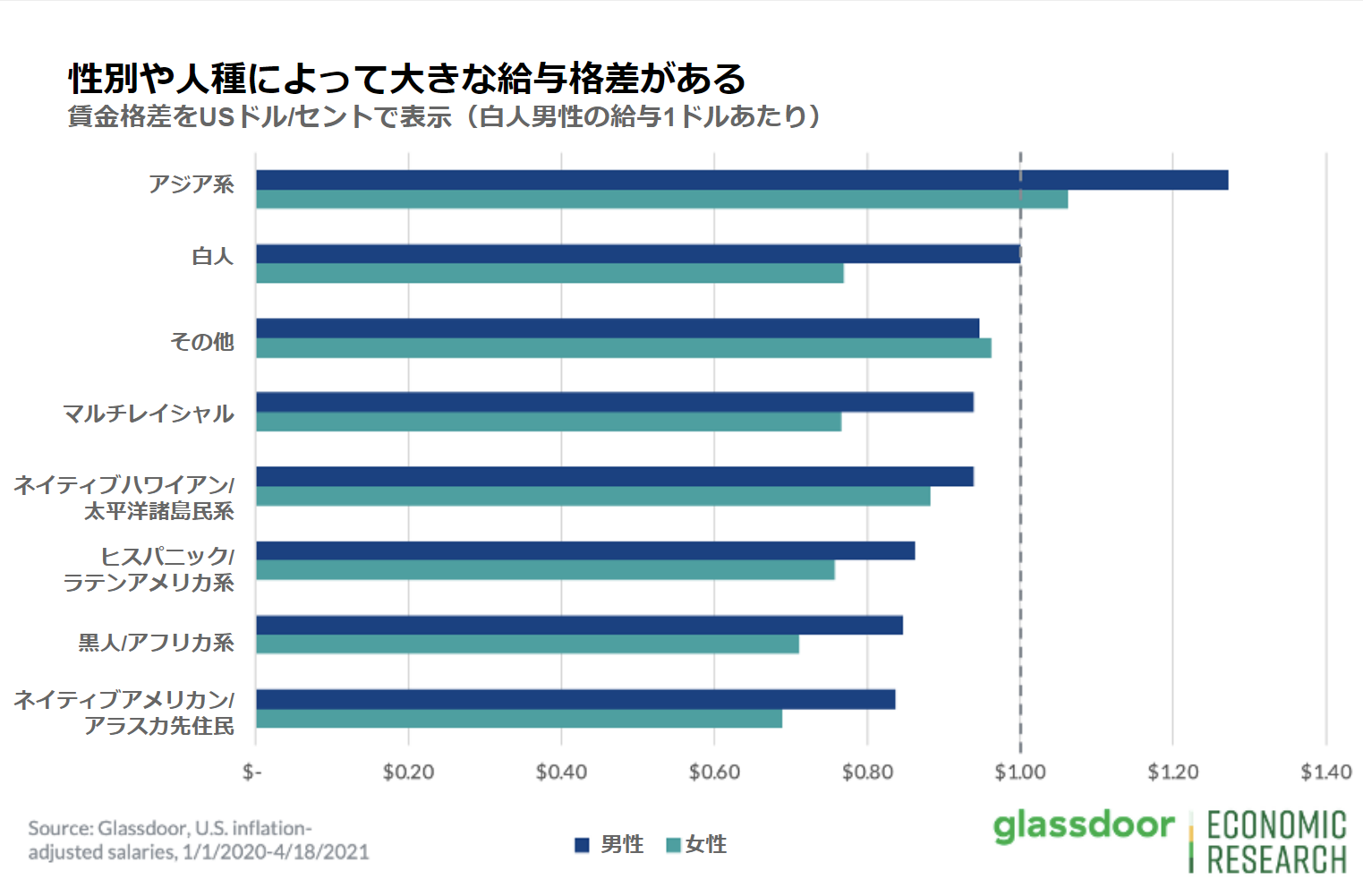 米国では、給与にまつわる情報に透明性がないことで給与交渉が多くの人にとって難しいものになっていること、さらにこれが米国内の給与の男女格差が是正されない一因にもなっていることも分かります。Glassdoorが2021年に行った分析(注2)によると、白人男性が1ドルの給与を受け取るところ、女性全体の平均は79セントにとどまるという結果が出ています。さらに女性のなかでも人種による格差が生まれていることも懸念すべき点です(ラテンアメリカ系の女性は76セント、アフリカ系の女性は71セント、ネイティブアメリカンの女性は69セント)。