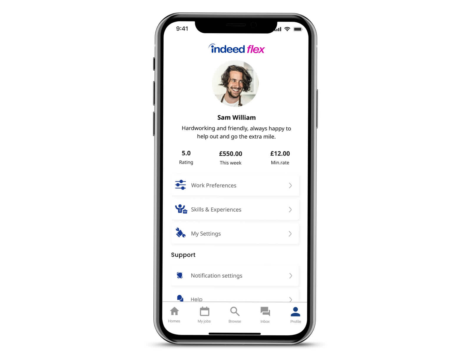 登録スタッフは、応募からシフト決定、給与の振込口座の指定まで、すべてをスマートフォンアプリ上で完結することができます。具体的には、簡単なプロフィールを入力し、Indeed Flexとの対面の面談で身分証と経歴の確認を受けてアカウント認証を完了した後は、スキル、勤務可能な場所や曜日・時間帯、希望の時給などの条件を入力するだけで、条件に合った求人が瞬時にリストアップされます。気に入ったものがあれば、職務明細を確認し、ワンタップで応募可能。シフトが決まったら、現場に直接赴いて与えられた役割をしっかり果たすだけです。業務終了後には、働き手と企業がお互いを5段階で評価するのですが、ここで企業から高い評価が得られれば、次の仕事探しがよりスムーズになります。給与は週ごとに直接銀行口座に振り込まれます。