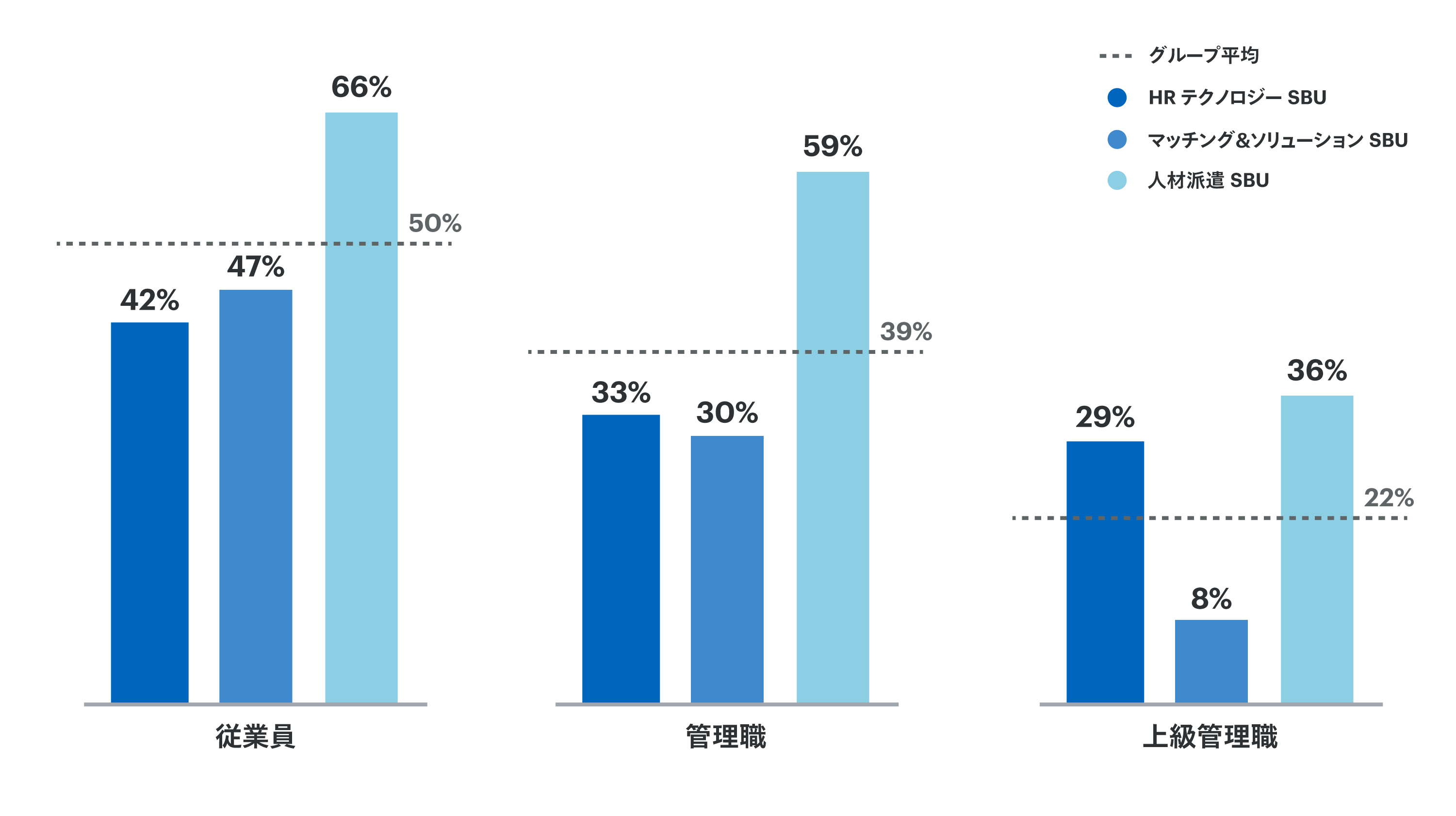 また、グループ全体で全ての職層でジェンダーパリティを目指す目標については、初めて戦略ビジネスユニット(Strategic Business Unit、以下SBU)ごとの数字を公開し(以下グラフ参照)、グループ全体での大きな挑戦はHRテクノロジーSBUとマッチング&ソリューションSBUの女性管理職比率であることを明らかにしました。