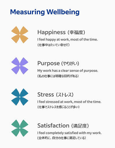 一般的な従業員アンケートでは、具体的な施策につなげたい企業の思惑を受けて、やりがいやエンゲージメント(貢献意欲)など、「職場」についてどう”考え”るかばかりが問われがちですが、職場にいる「個人」がどう”感じ”ているか、どんな”感情”を抱くのかも測定するのがワーク・ウェルビーイング・スコアのユニークなところです。着想を得たのは英国の国家統計局が行う世論調査で、「あなたは幸せですか?」「ストレスや不安を感じていますか?」という質問を、職場の文脈に置き換えて取り入れました。