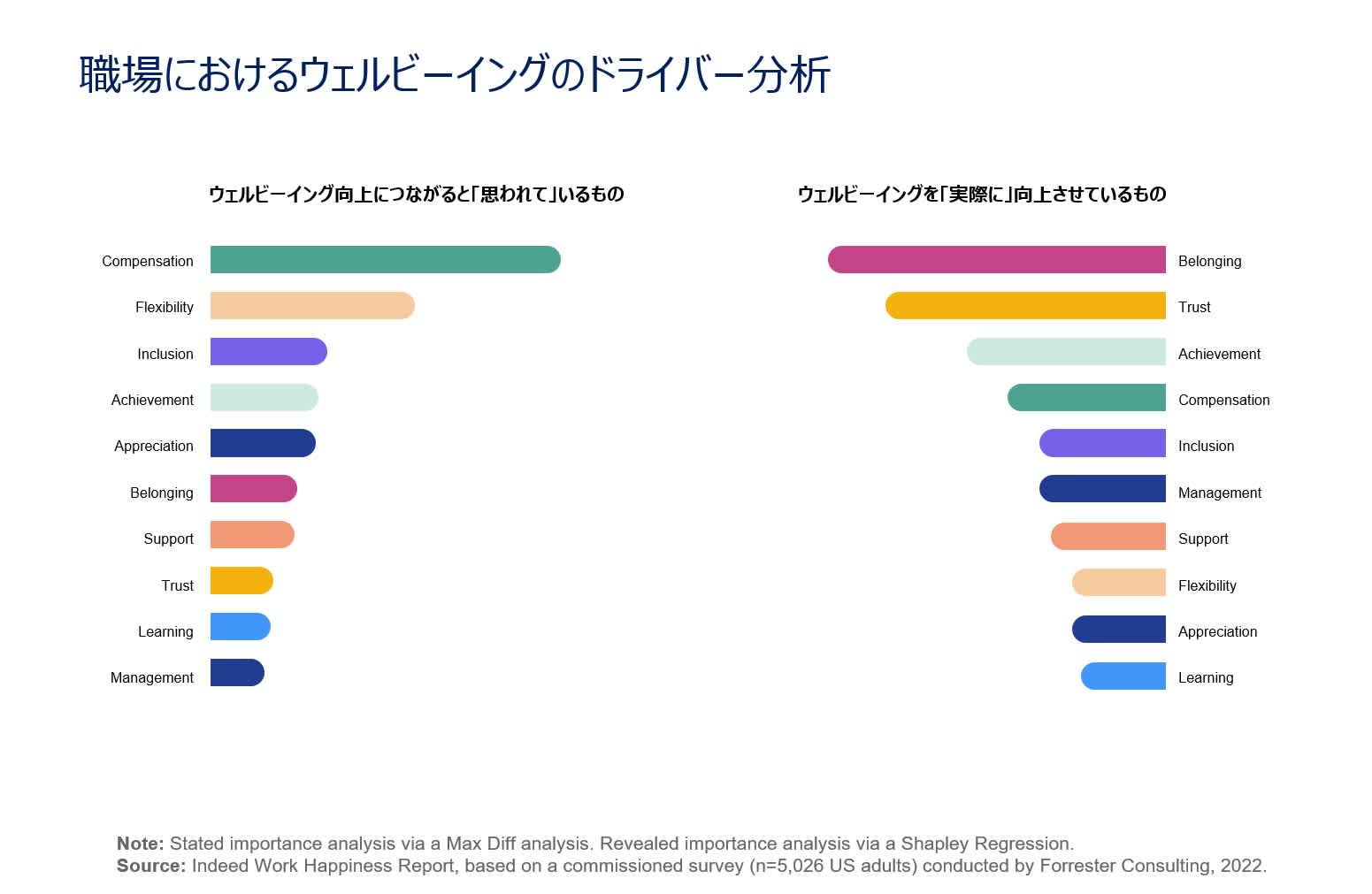 これまでの分析で、11のドライバー項目のうちBelonging(帰属意識)が最も職場のウェルビーイングに強い影響力を持っていることが分かってきました。一方で、別途実施したマネージャー層への意識調査では、Compensation(報酬)が最も大きい影響力を持つと考えられていて、Belongingはまったく重視されておらず、マネージャー層の直感と現実の間には大きな乖離があります。今後、実態に沿って社内のリソース配分などが最適化されれば、職場のウェルビーイングがさらに向上する可能性も十分あるでしょう。