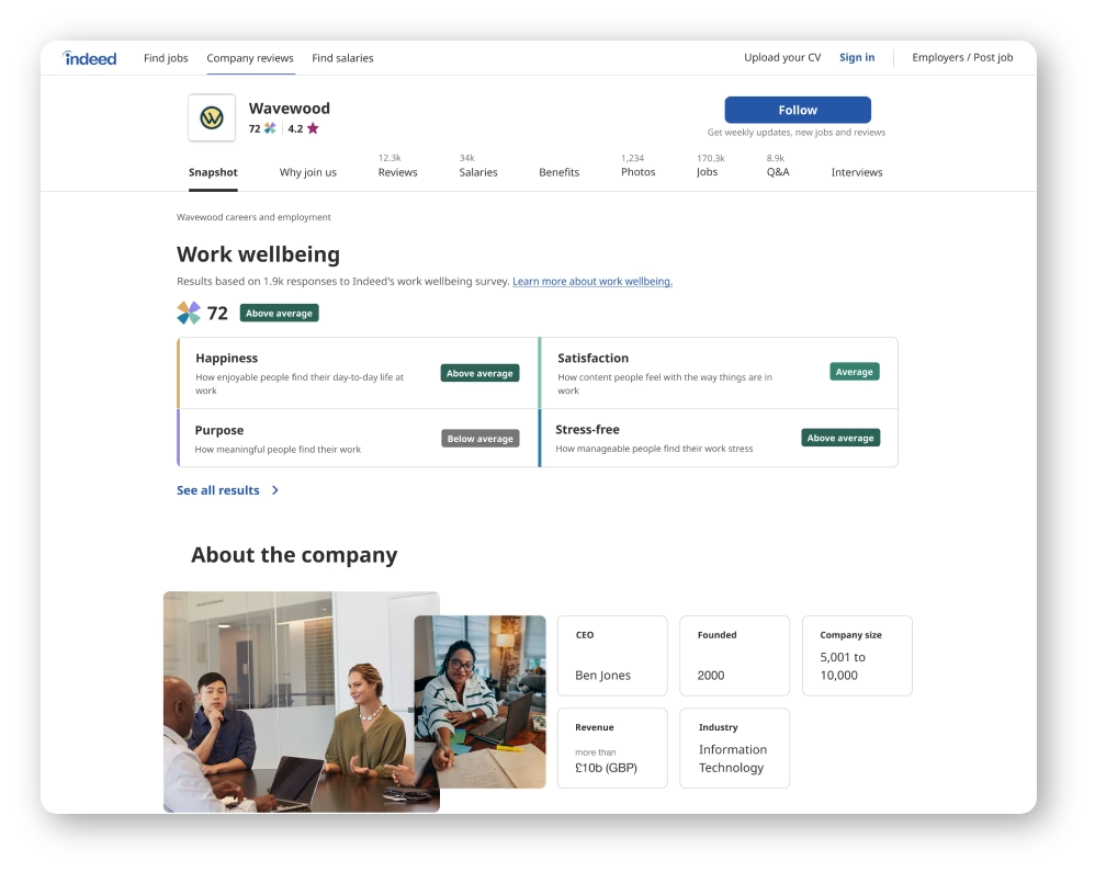 ワーク・ウェルビーイングスコアはIndeedの会社概要ページに表示される