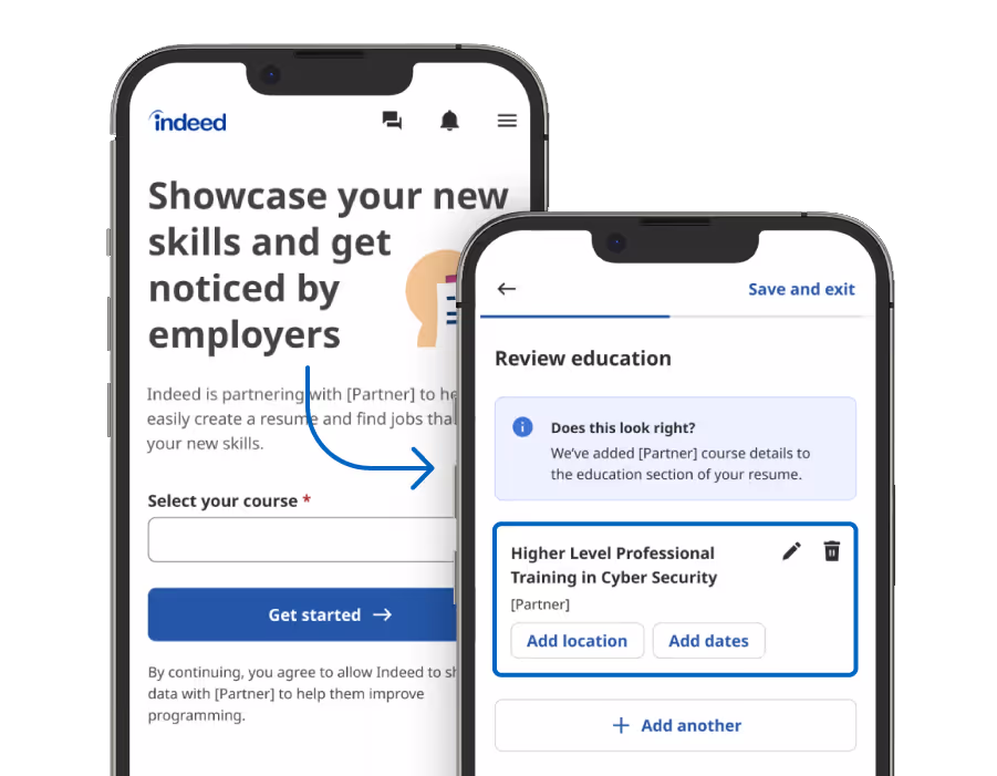 また、米国では、パートナーシップを通じてSkill Connect(英語のみ)というサービスも提供しています。Indeedのパートナー団体が提供する職業訓練プログラムを修了した求職者が、Skill Connect上で専用の履歴書作成手順に沿って、プログラムごとに事前に設定されたスキルや資格の候補を選択していくだけで、簡単に履歴書を作成することができるサービスです。求職者の受講履歴やスキル情報は、Indeed上で求人活動をしている企業に公開され、スキルを持つ人材を求める採用企業とのマッチングに活用されます。