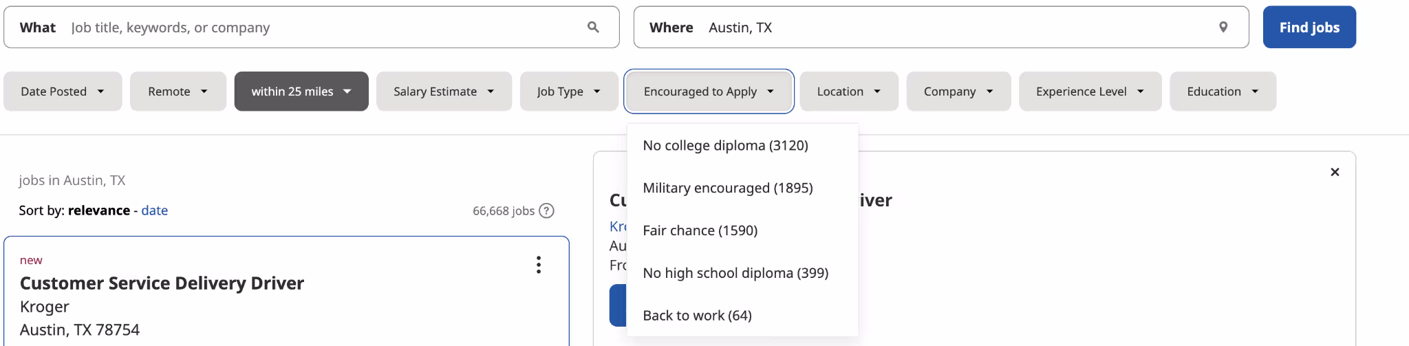 まず、Indeedのプラットフォーム上では、「学士号不要(No college diploma)」や「高卒資格不要(No high scohol diploma)」という検索フィルターを設けて、求職者が学歴不問の求人情報を見つけやすくしています。また、企業の求人作成画面上では、従来行っていた学歴要件項目の入力レコメンドを廃止。これにより学歴を要件とせずに募集をする企業が増え、さらにそういった企業の応募者も増加しました。