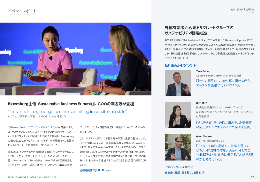 見どころについて太田はこうも語ります。「近年のRGPでは、サステナビリティ活動のProsper Together(経営戦略の3つ目の柱)に多くのページを割いています。リクルートグループは、サステナビリティと事業を一体として考えており、事業のど真ん中でソーシャルインパクトの中期目標を置いている点などは、世界中の機関投資家の方々からも、非常にユニークかつ最先端のサステナビリティ経営実践例であるという評価をいただくようになりました。このような社外評価をお伝えすることも客観情報という点で重要だと考え、2024のRGPには社外の方から頂いたメッセージも掲載しています。」