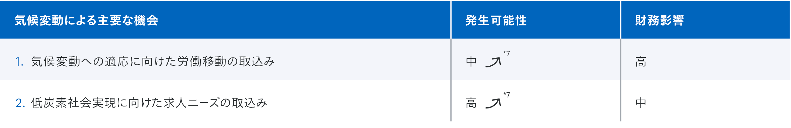 気候変動に伴う主な機会2点と、その発生可能性・財務影響を示す表。例えば、「気候変動への適応に向けた労働移動」の発生の可能性は中程度で財務影響は高い。