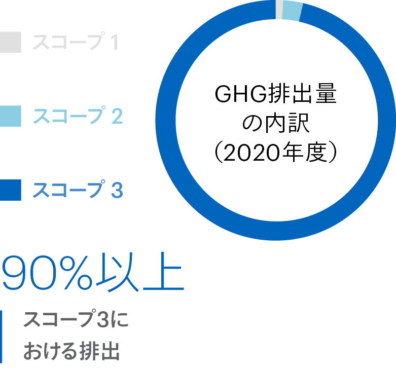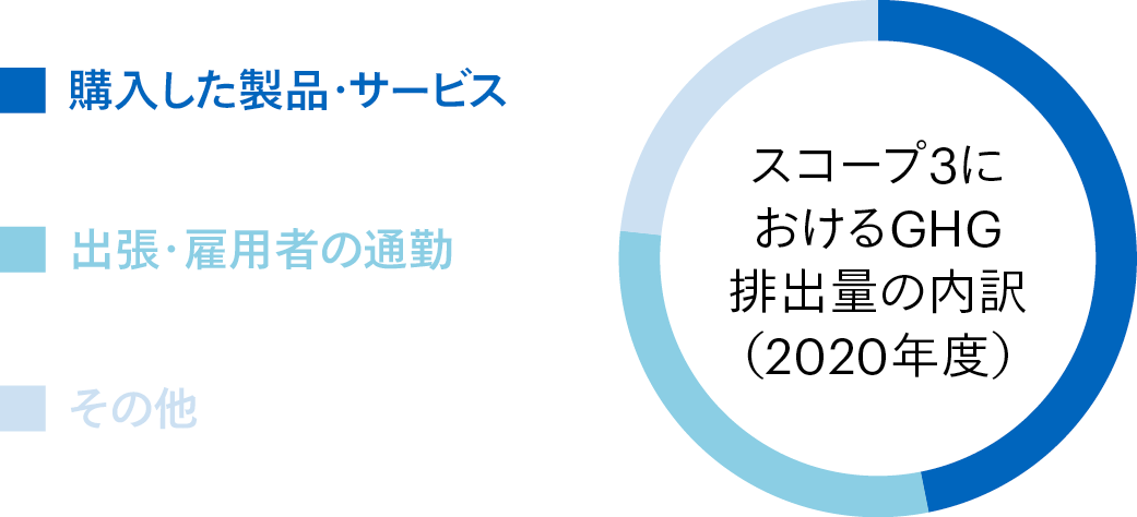 2023年度のGHG排出量の内、スコープ3が95%以上を占める様を示す図。内訳は、「購入した製品・サービス」「出張・雇用者の通勤」「その他」がおよそ1/3ずつを占める。