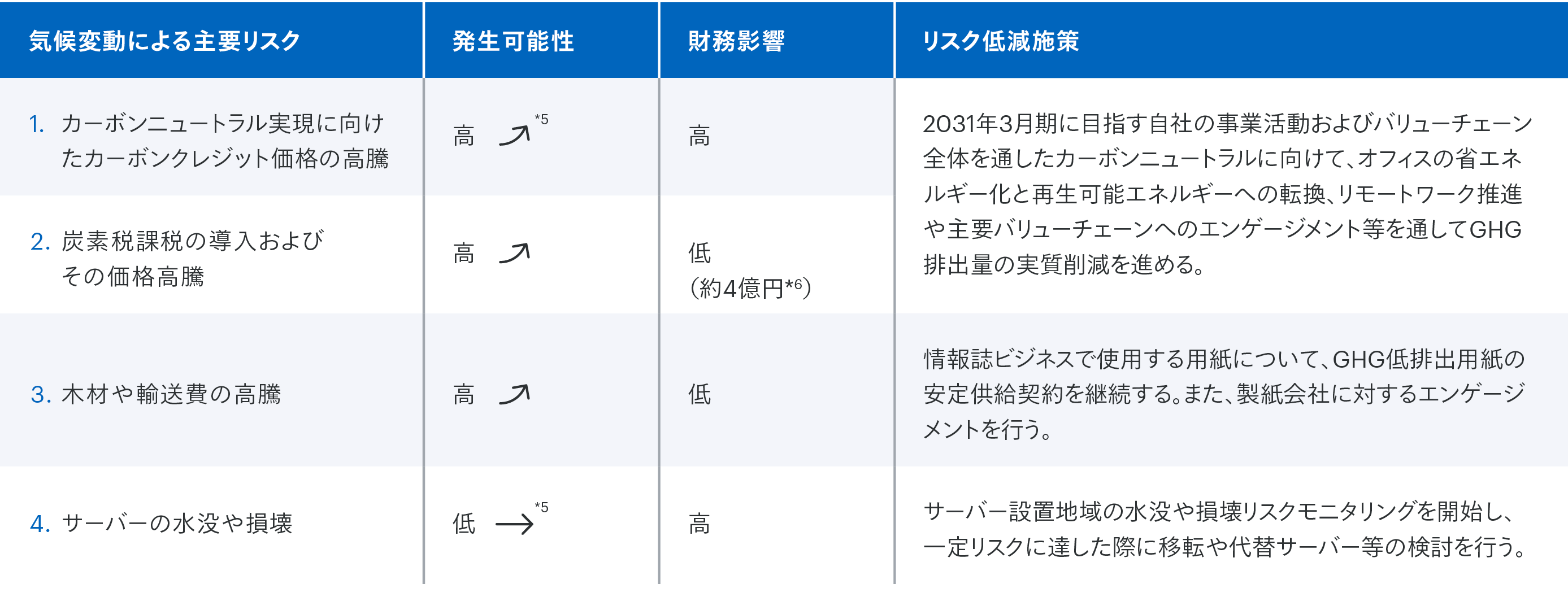 気候変動による主なリスク3点と低減施策を示す表。例えば、「カーボンクレジット価格の高騰」「炭素課税の高騰」に対しては、オフィスの省エネルギー化や再生可能エネルギーへの転換などによりGHG排出実質削減に着手している。