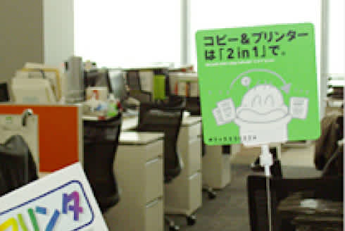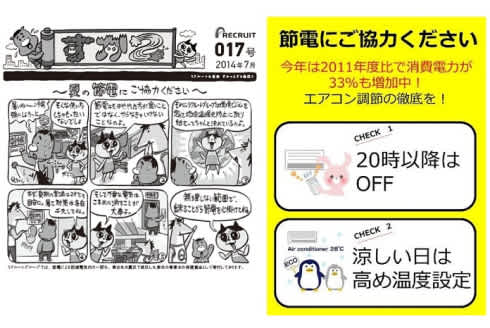 リクルートグループでは、2009年度より国内拠点を中心にオフィス生活におけるエコ活動の積極的な実施を始めました。現在も継続的に、グループ総務部を中心にリクルートグループ全体に対して啓発活動を実施しています。たとえば、トイレの壁などに、イラストを多用し具体的な取り組み内容を示した啓発ポスターを掲示しています。また、社員のマナー啓発や社内イベントを紹介する社内広報紙「すか2」でも、節電や紙の無駄遣い削減を呼びかけています。